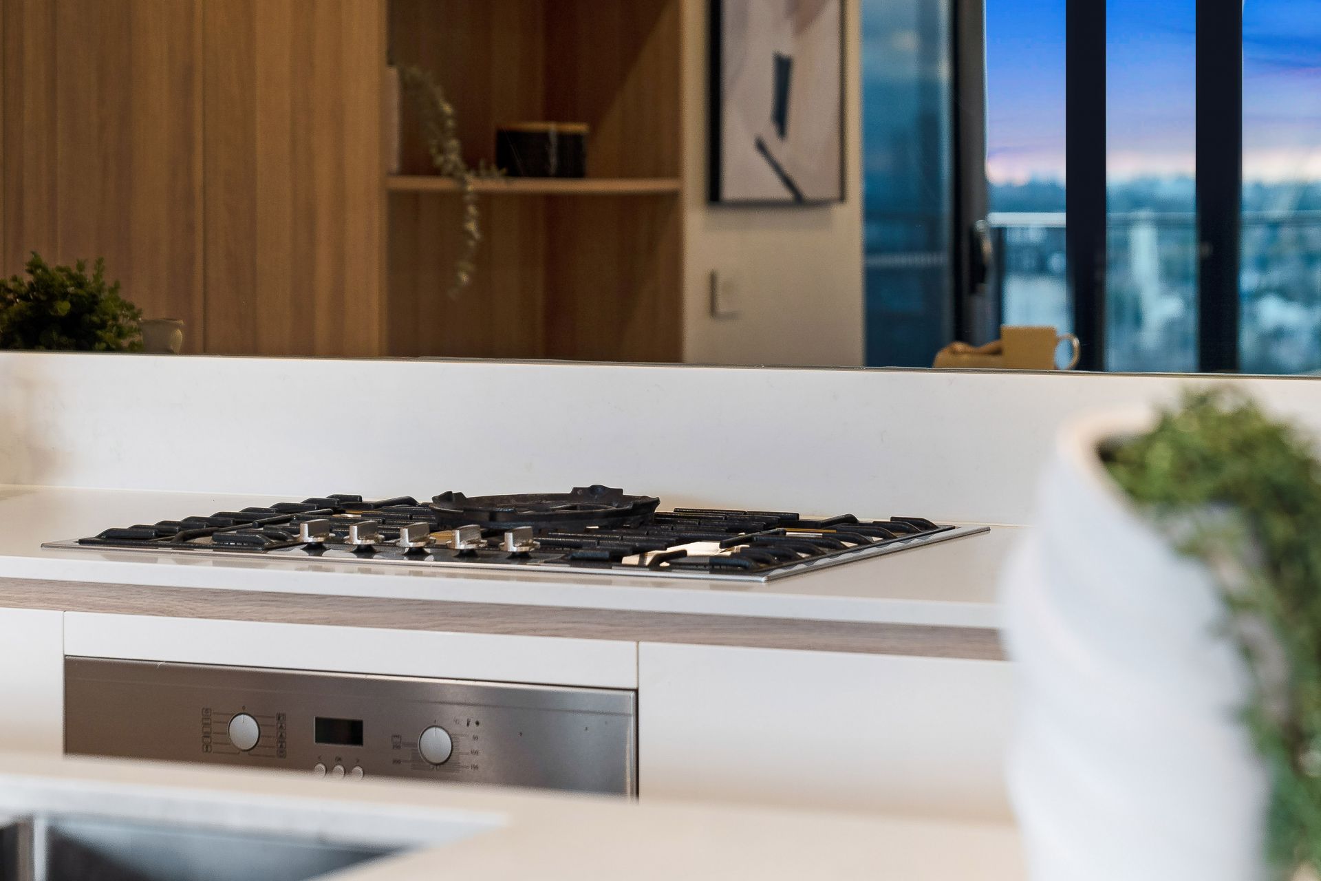 • Kitchen: Gourmet design featuring high-end appliances, including a gas cooktop, oven, rangehood, dishwasher, and microwave